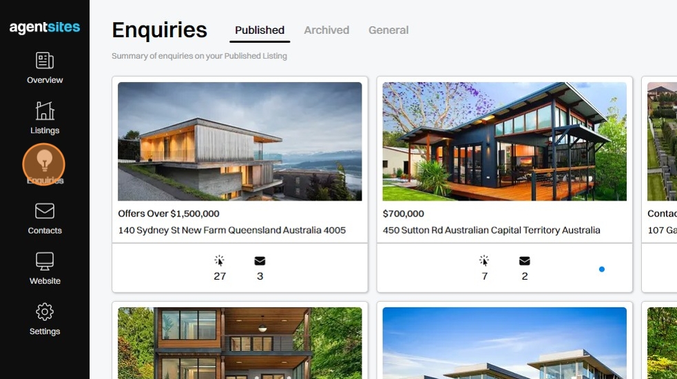 Click Published to view Enquiries made to Listings currently published on your live Website.
