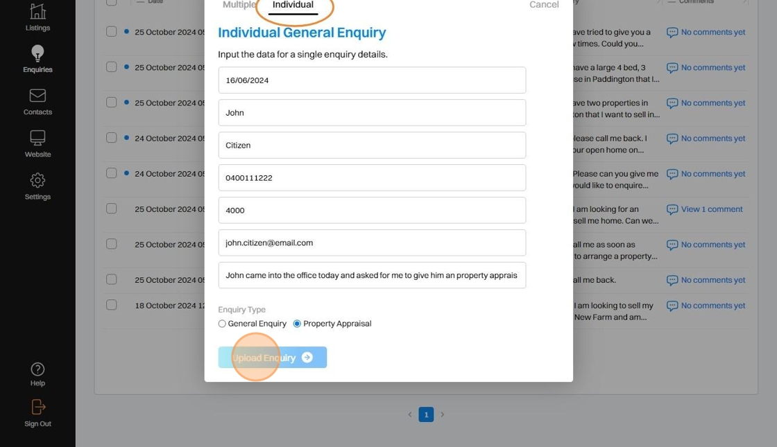 5. To add an Individual Enquiry to a Listing, populate the Individual Listing Enquiry form and click Upload Enquiry.