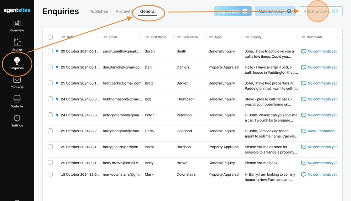 Instructions for you to add General Enquiries or Listing Enquiries manually based on your external communications, rather than Enquiries submitted by others through your live Website. You have the option to manually add Individual Enquiries or bulk upload Multiple Enquiries using a template CSV file populated with multiple Enquiries at one time. This article provides instructions for both options.