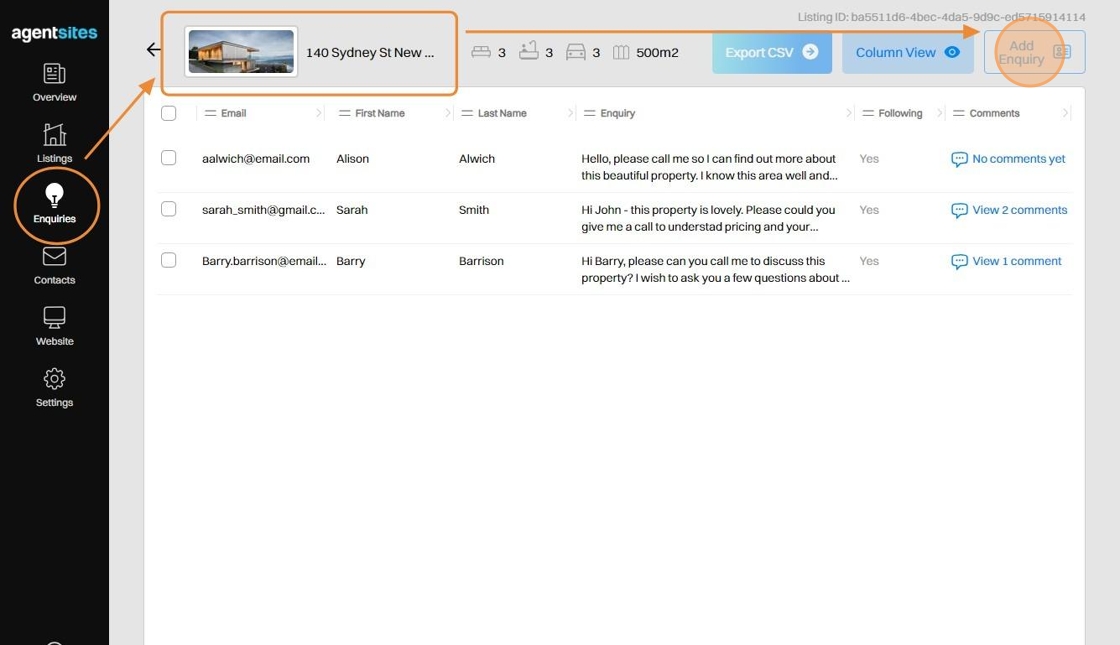 3. Click Add Enquiry from the selected Listings Enquiries summary page.