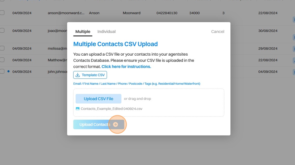 8. Once your populated template CSV file has finished uploading, select the Upload Contacts button.