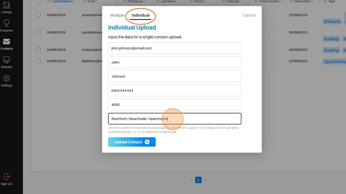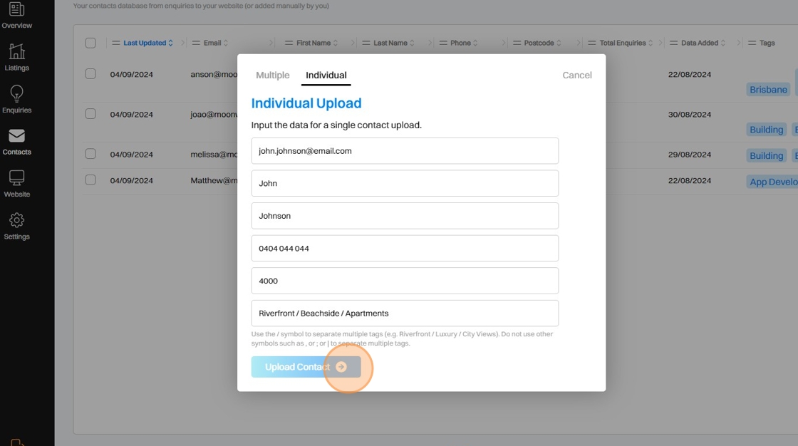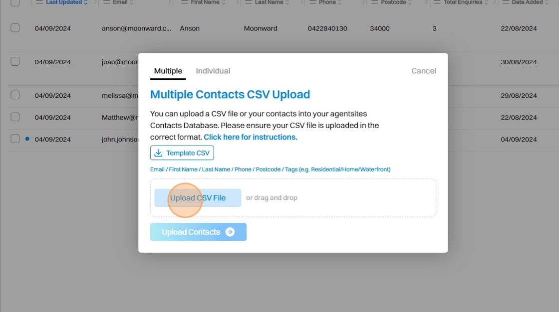 You can manually add Contacts into your database - this is in addition to those automatically captured from your Enquiries. You can either add an Individual contact one at a time, or you can Bulk Upload Multiple Contacts using a template CSV file. This article provides instructions for adding an Individual Contact or Bulk uploading Multiple Contacts.