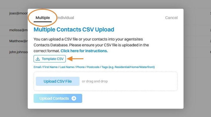 Download the Template CSV file which you will use to populate with your Bulk Contact information.