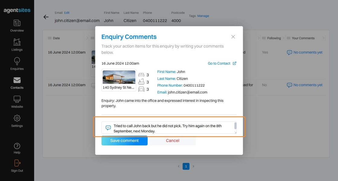 6. Close the Enquiry Comments window. Your comment / to-do note will be saved in the contact database.
