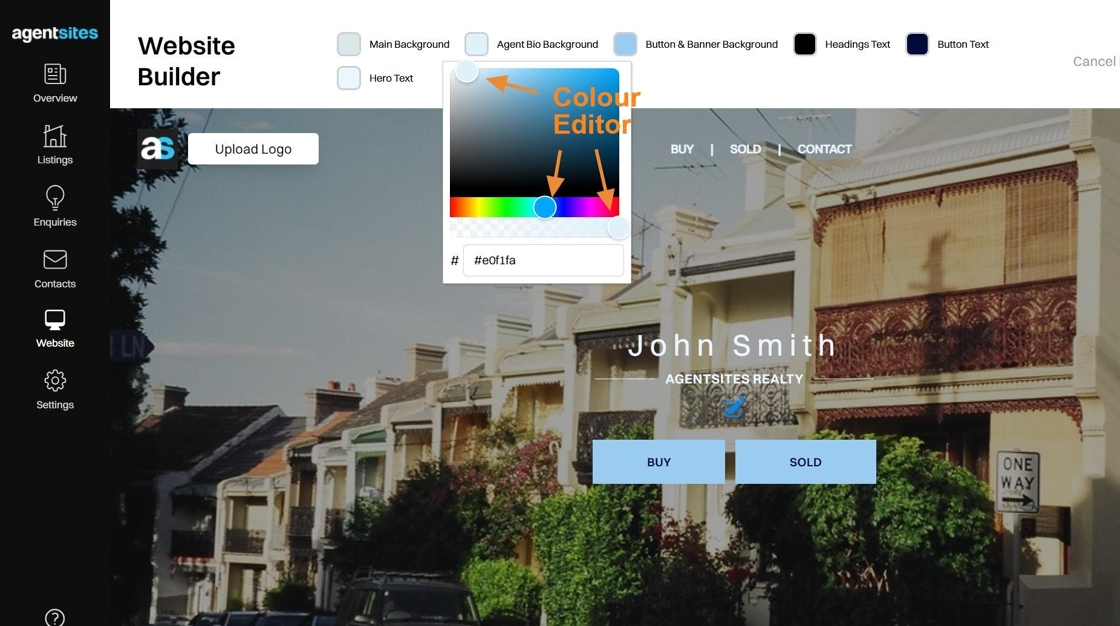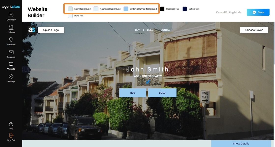 You can change the background colours of your Website, including the buttons, banners and general page background colour.