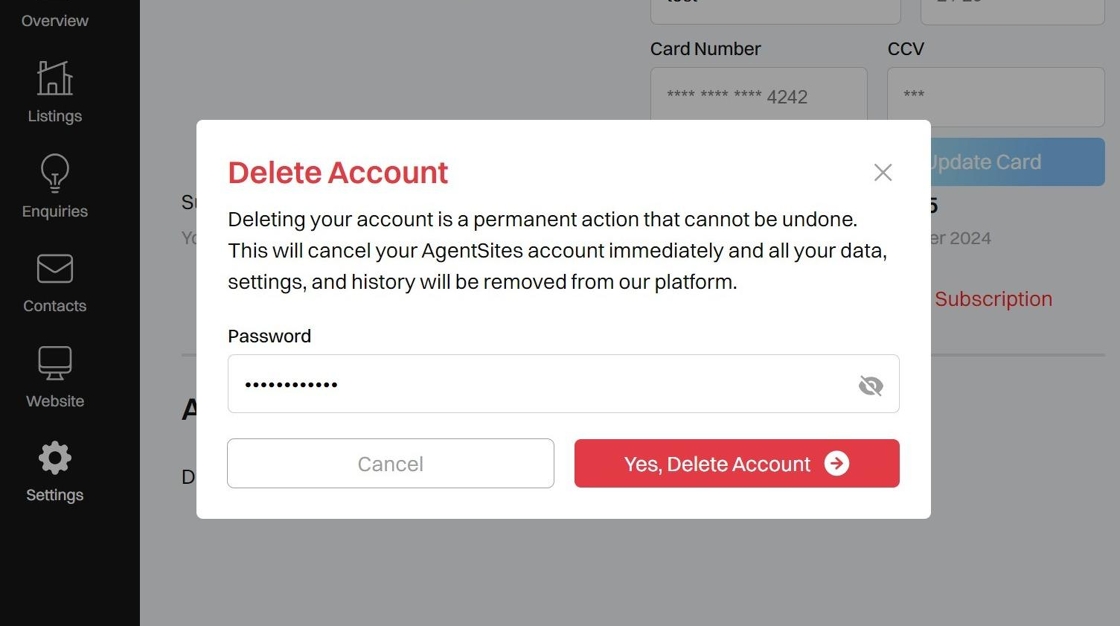 3. Enter your Password and confirm 'Yes, Delete Account'.