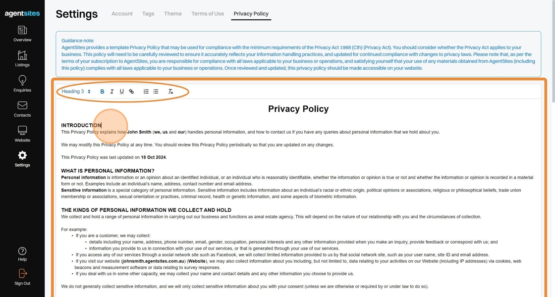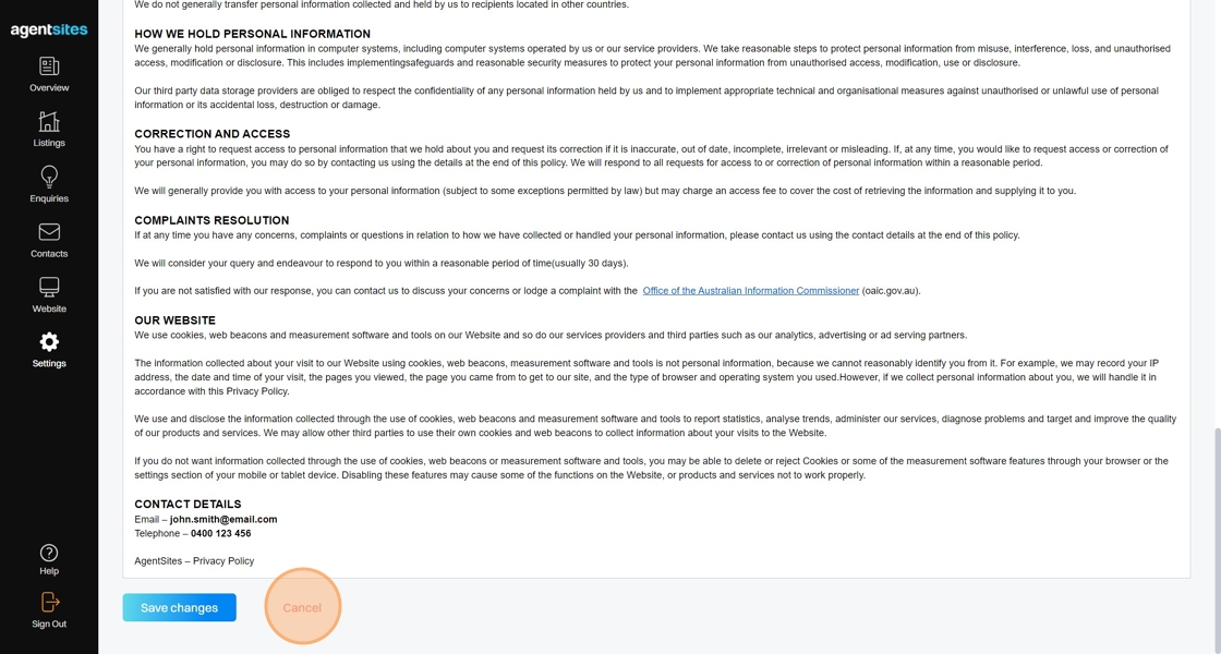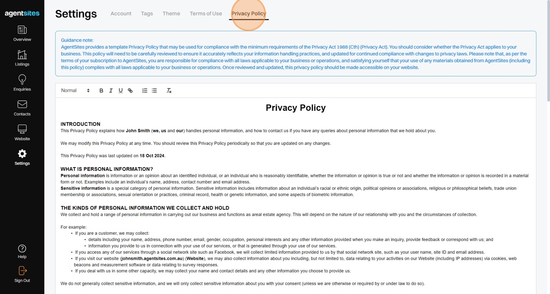 Alert: The Privacy Policy displayed on your live Website is populated directly from within your account settings in the Agentsites platform.