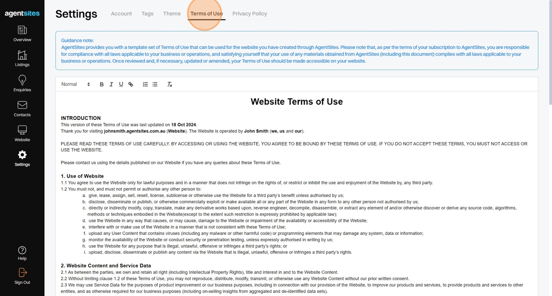 Alert: The Terms of Use displayed on your live Website is populated directly from within your account Settings within the Agentsites platform.