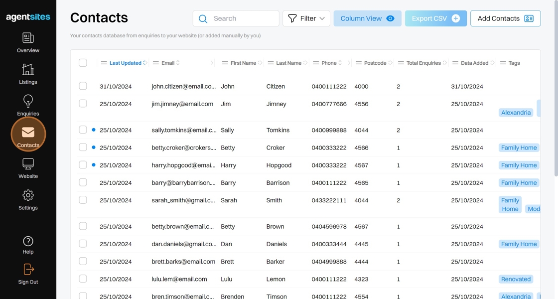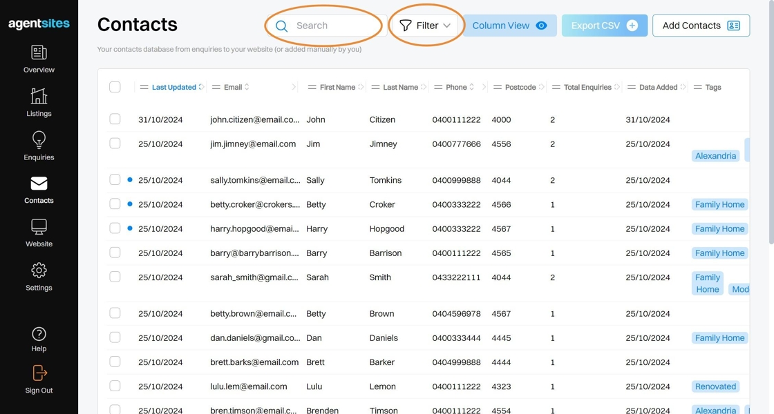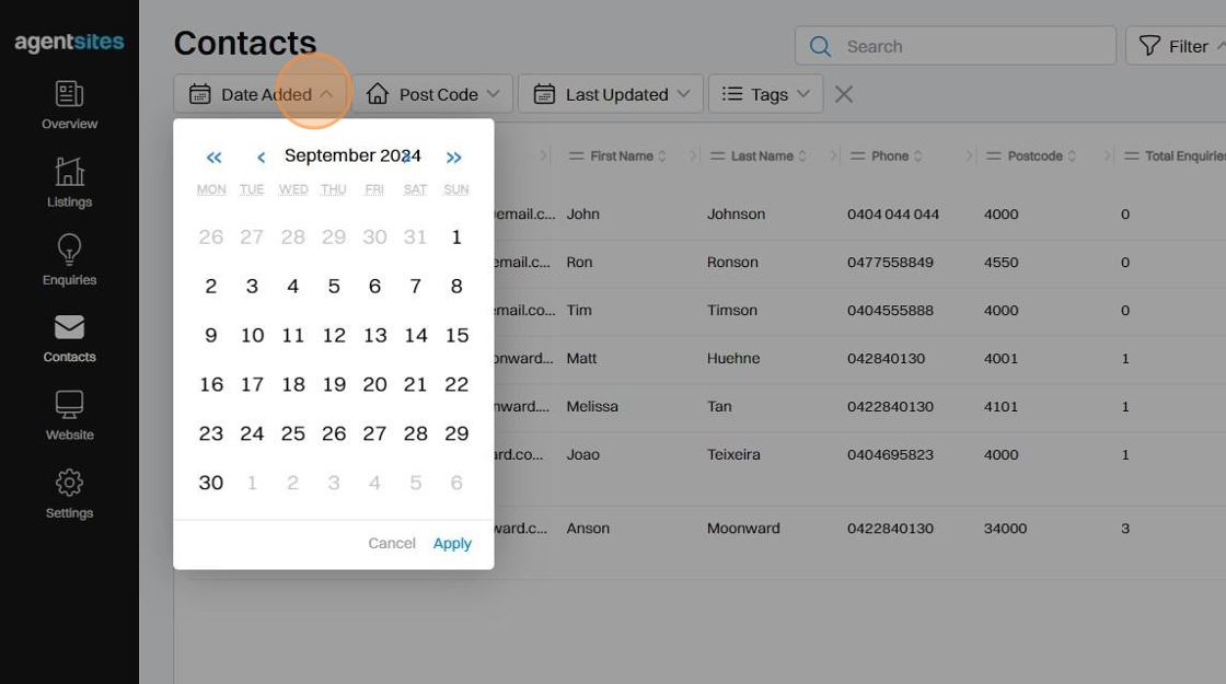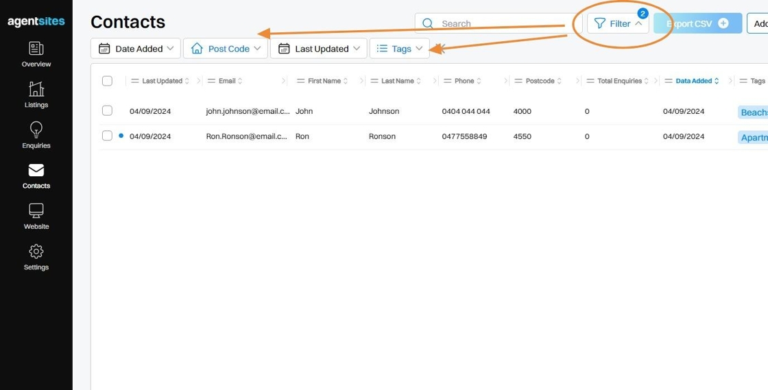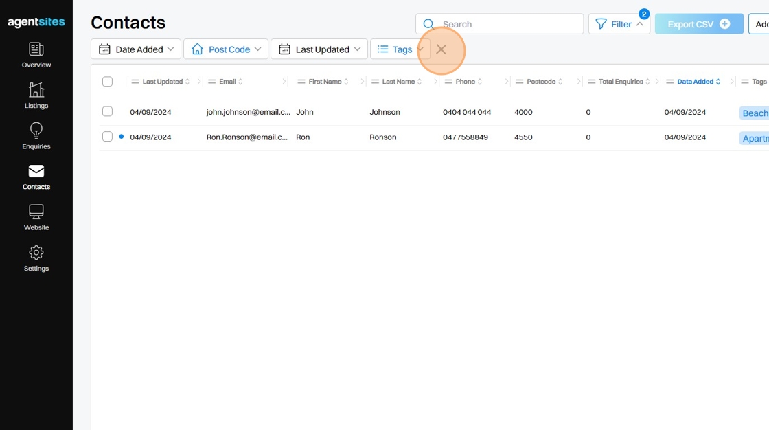 7. Apply filters across Date Added, Post Code, Last Updated and / or Tags.