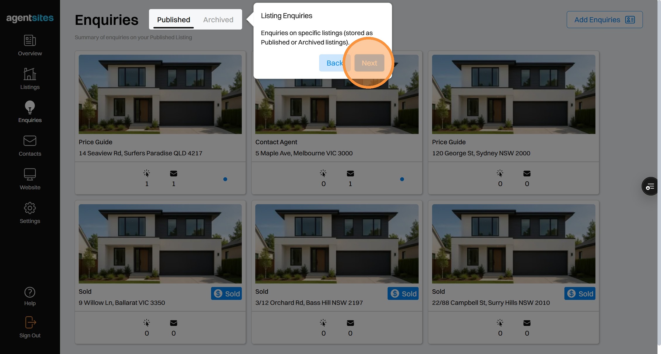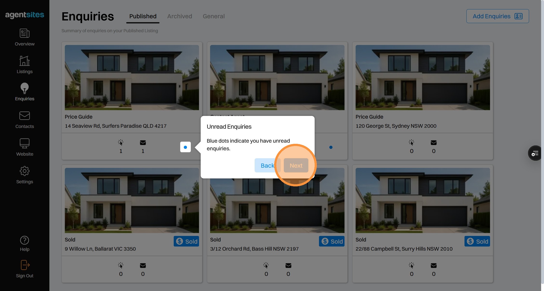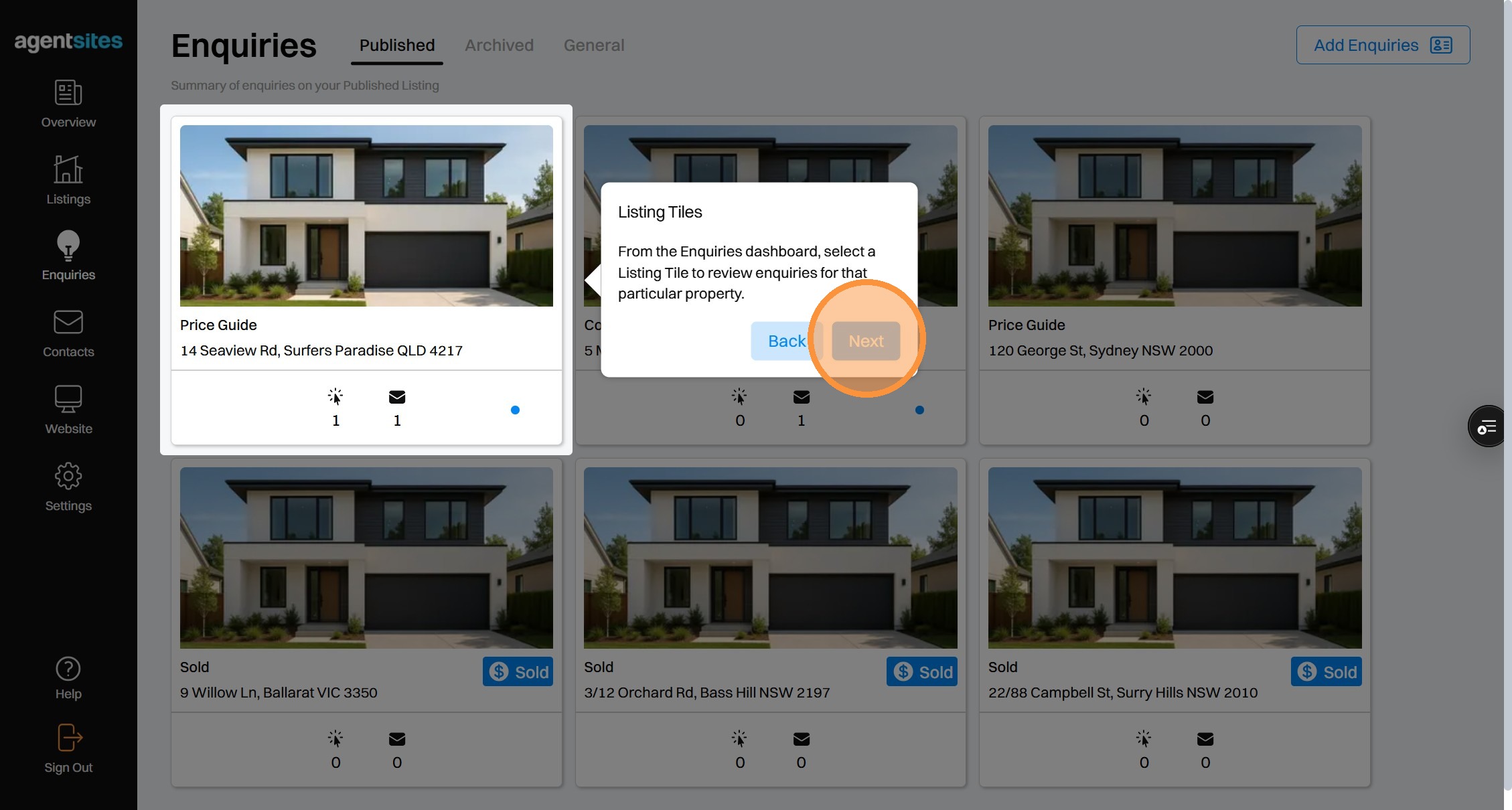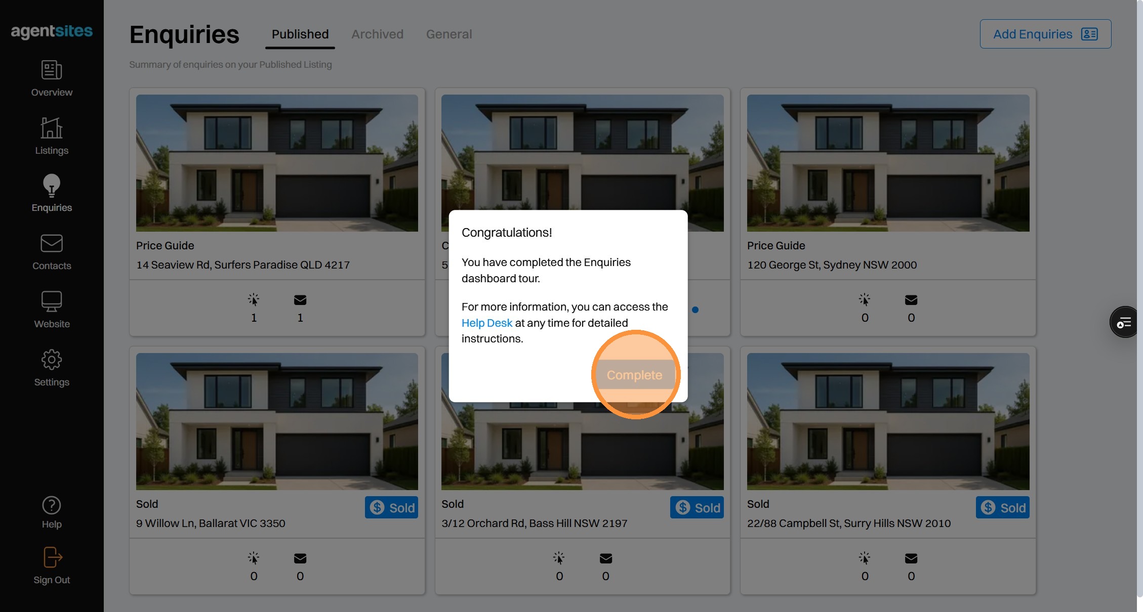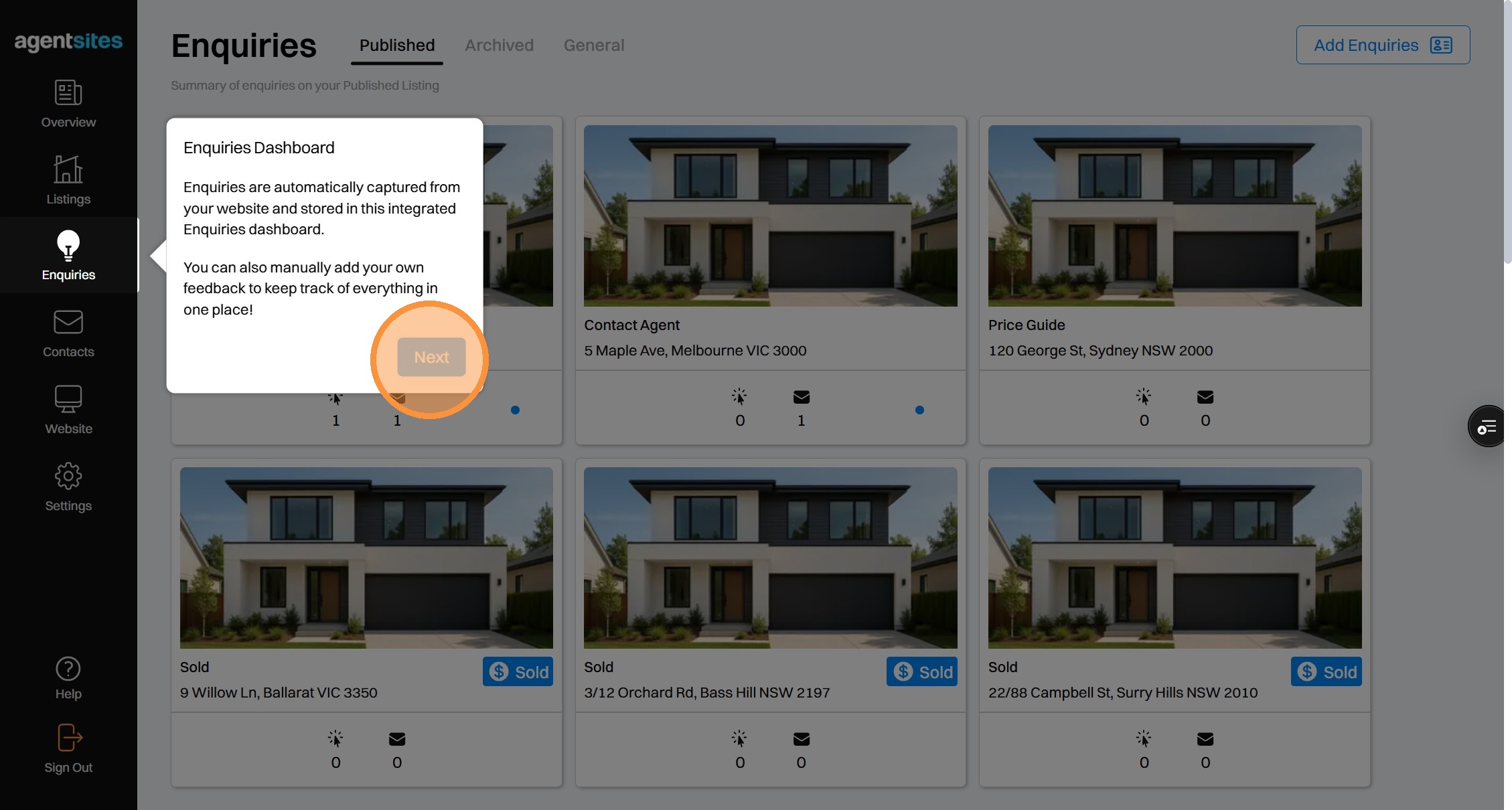 Walkthrough tour of the 'Enquiries' dashboard.