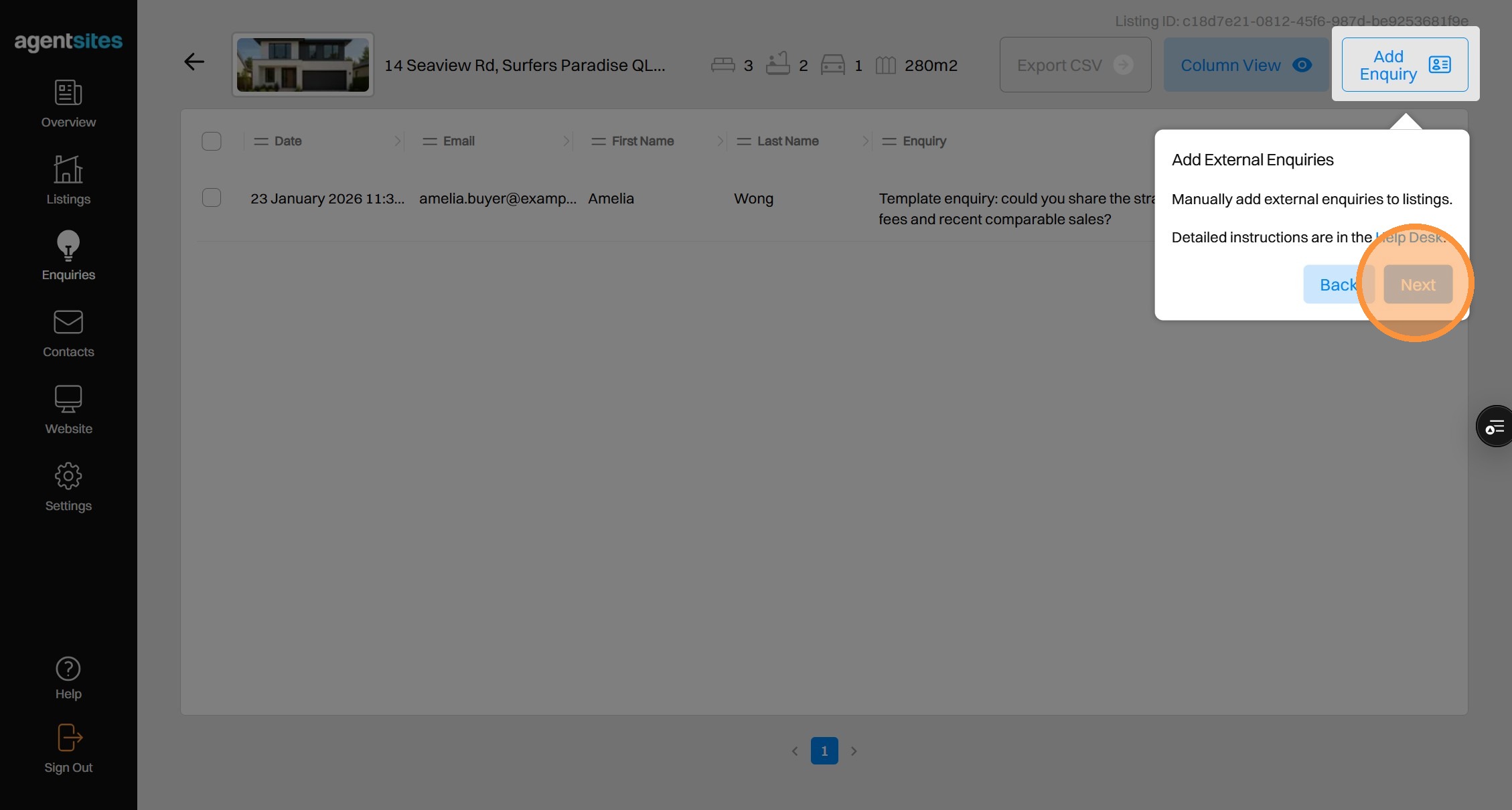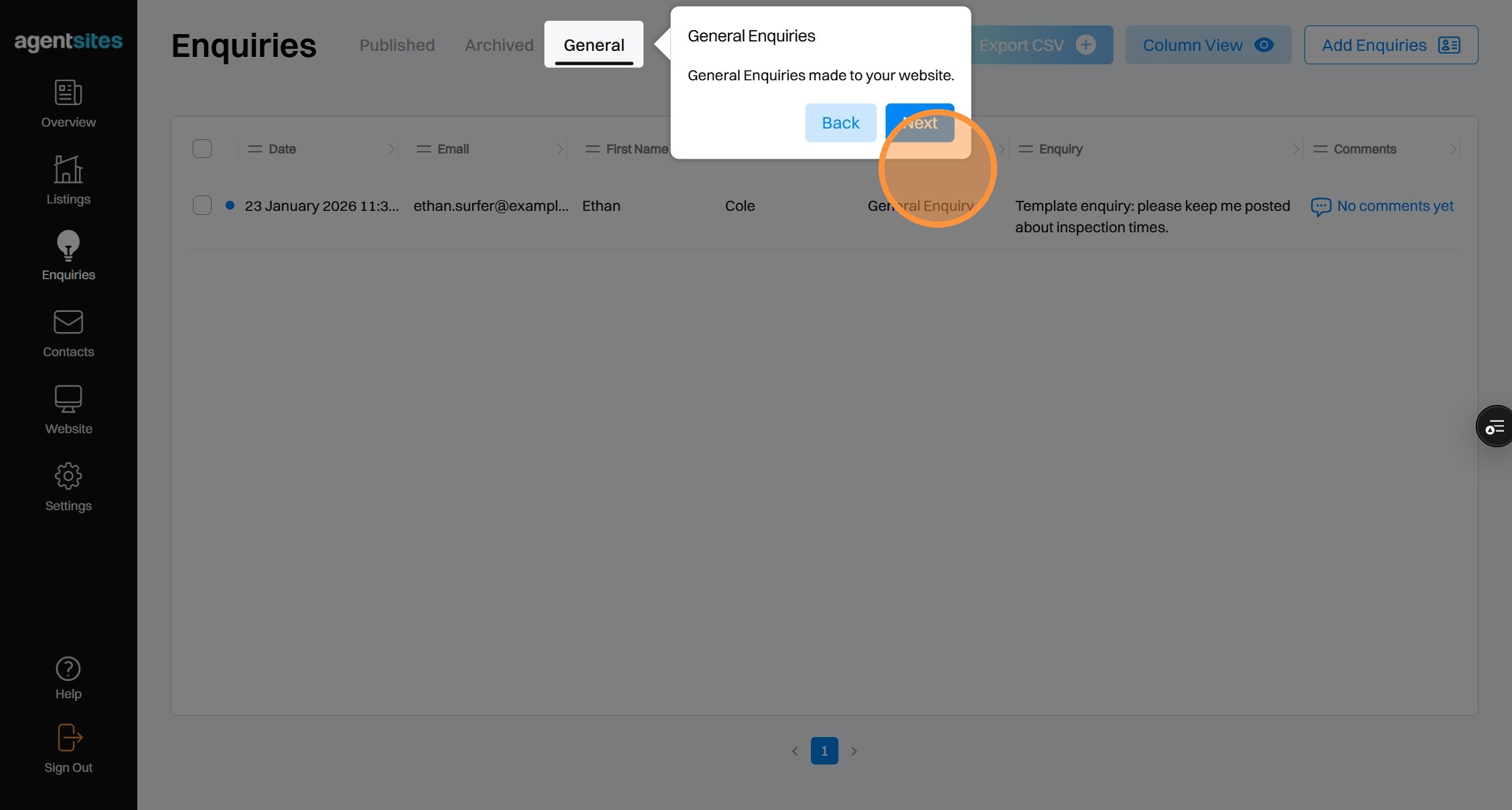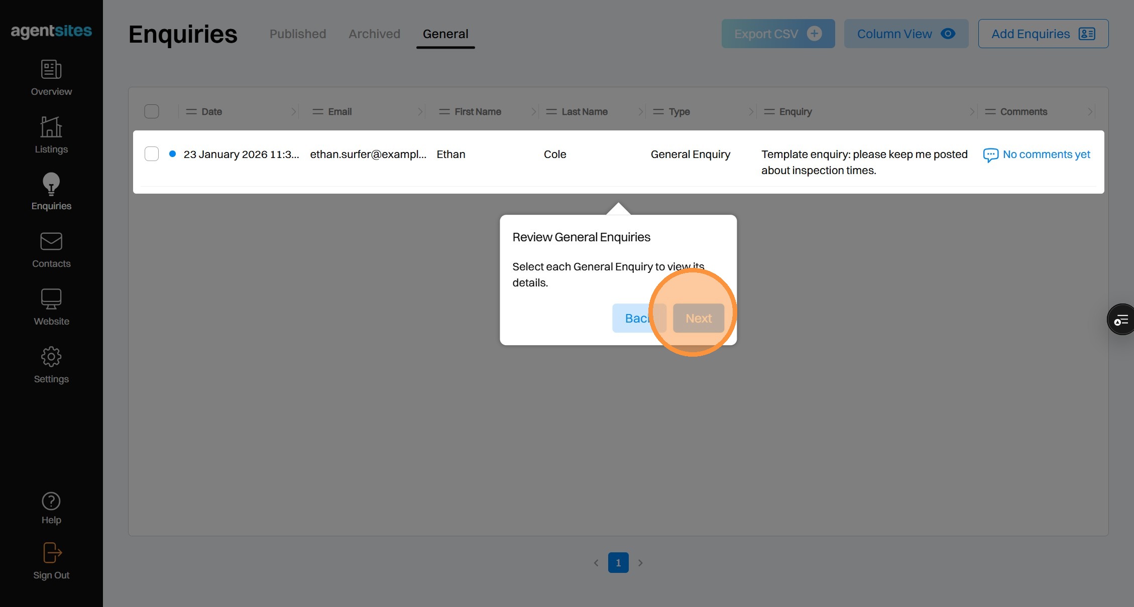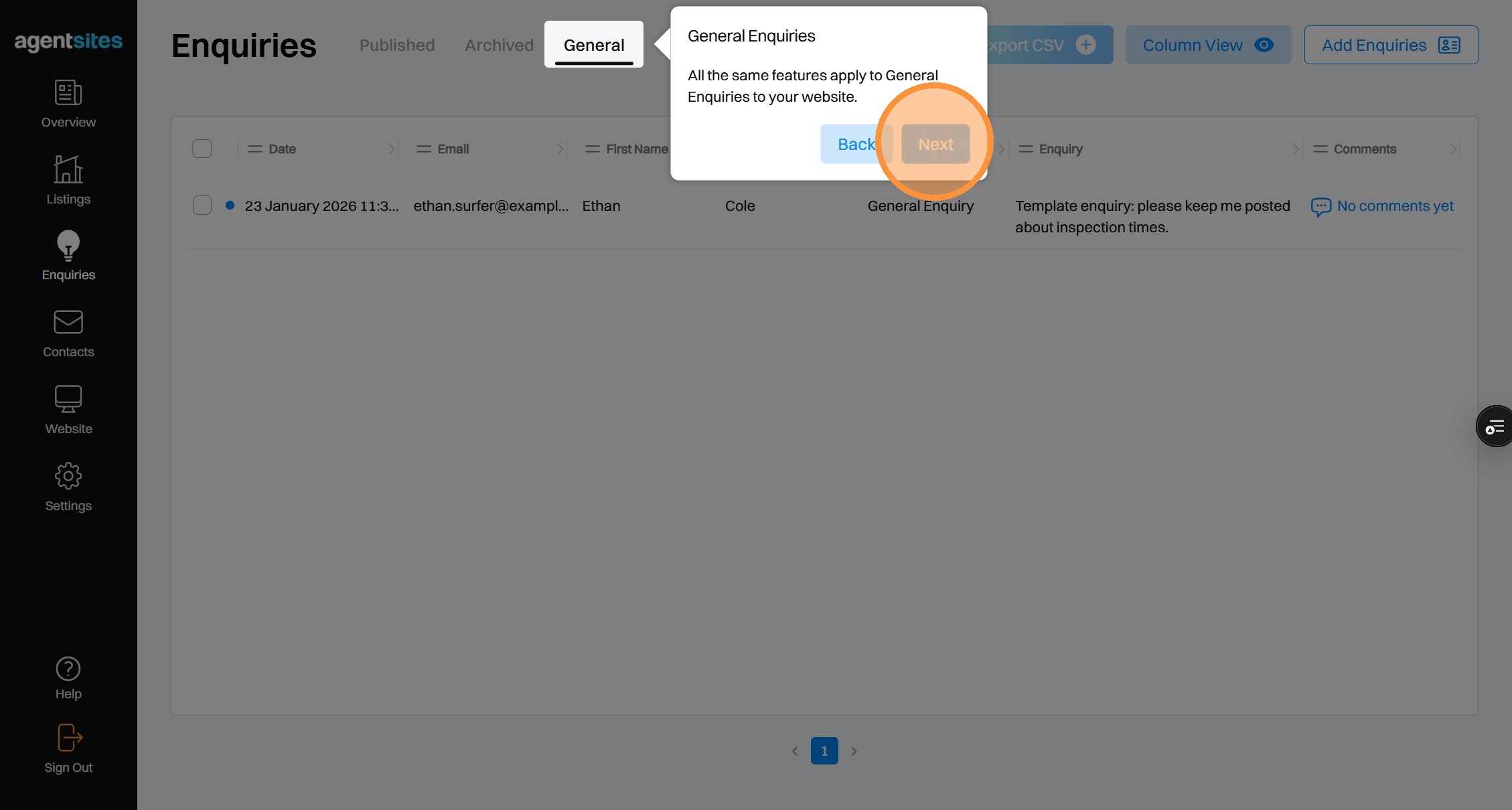 Walkthrough tour of the 'Enquiries' dashboard.