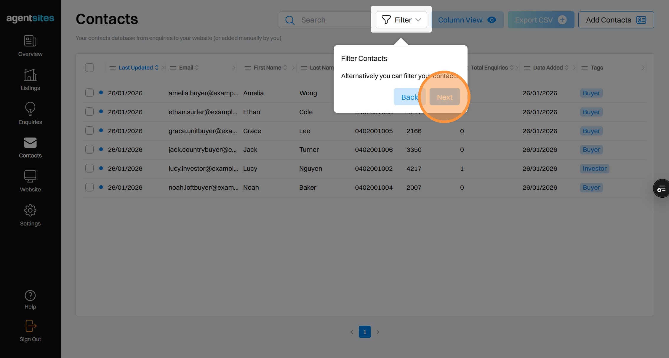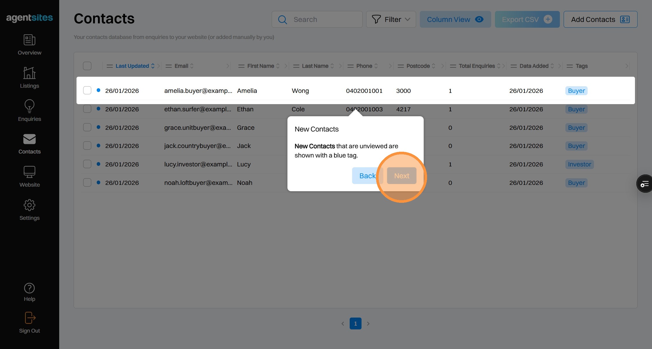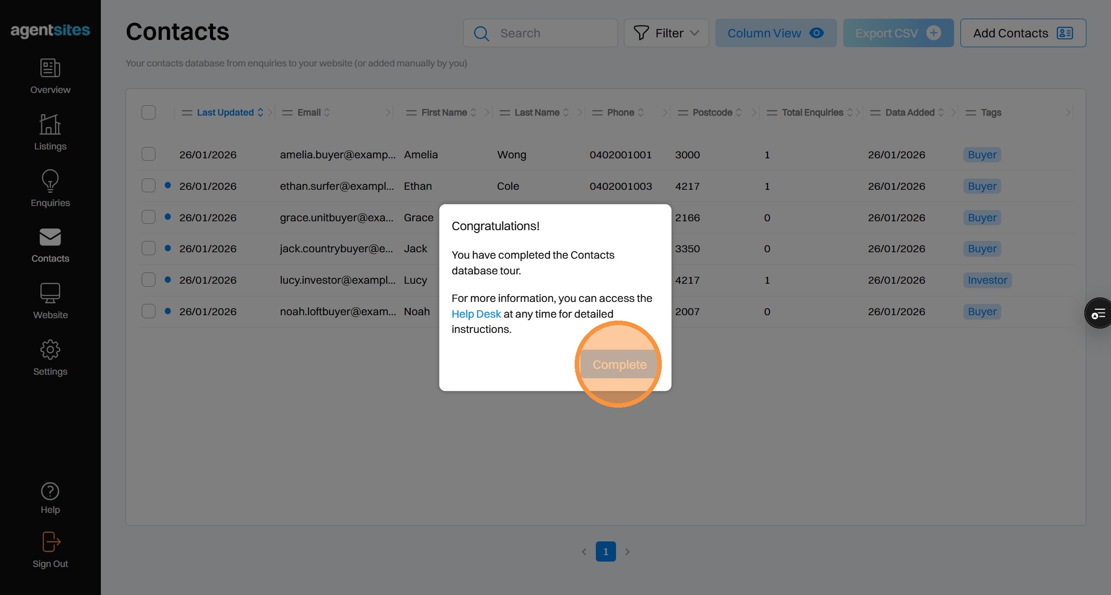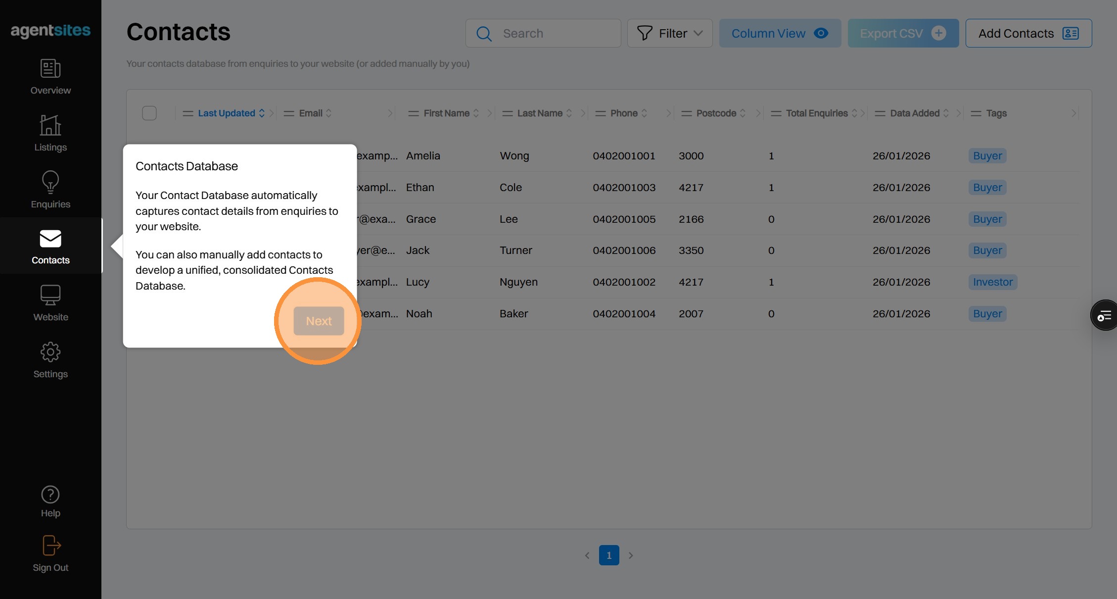 Walkthrough tour of the 'Contacts' dashboard.
