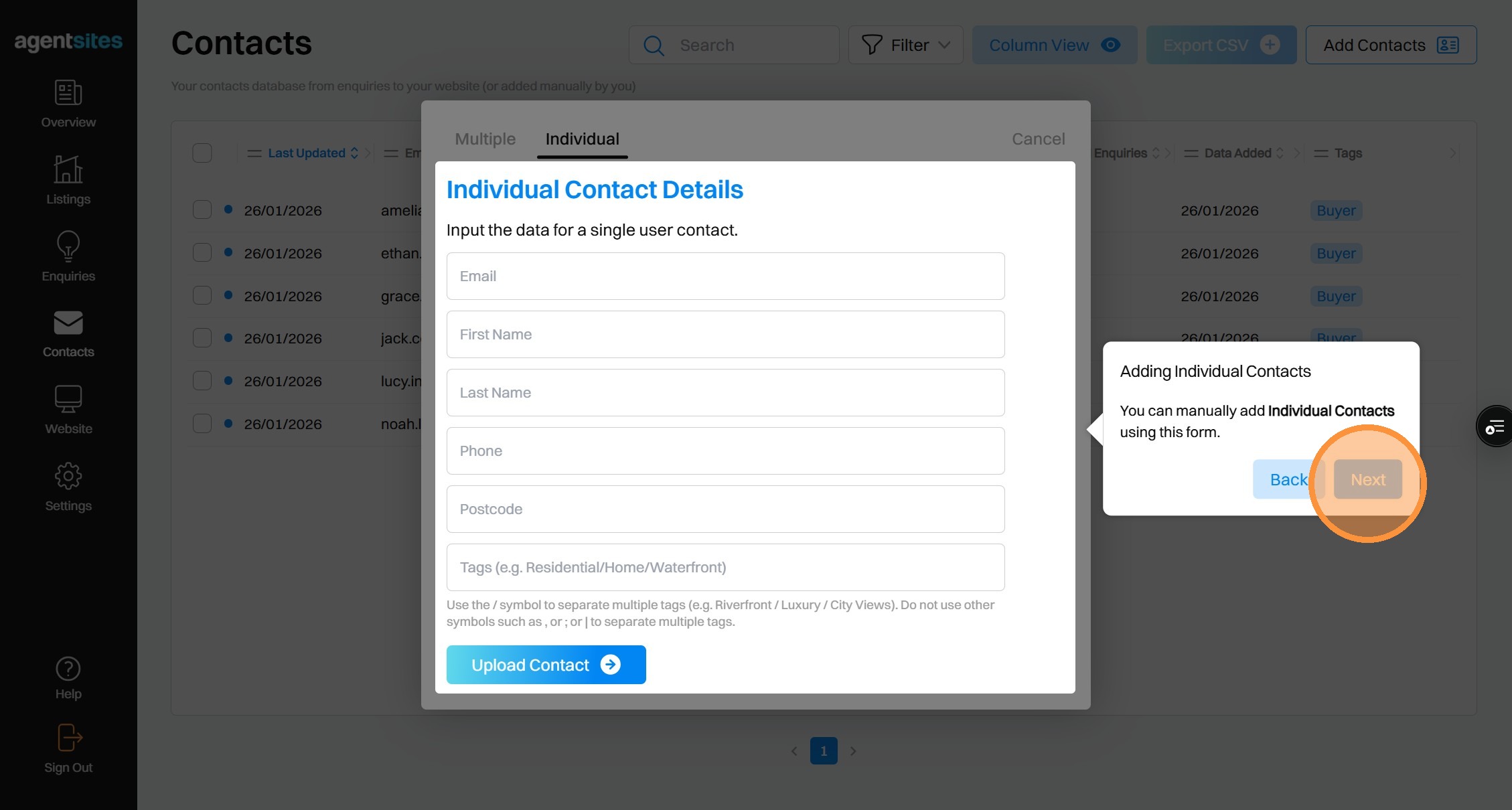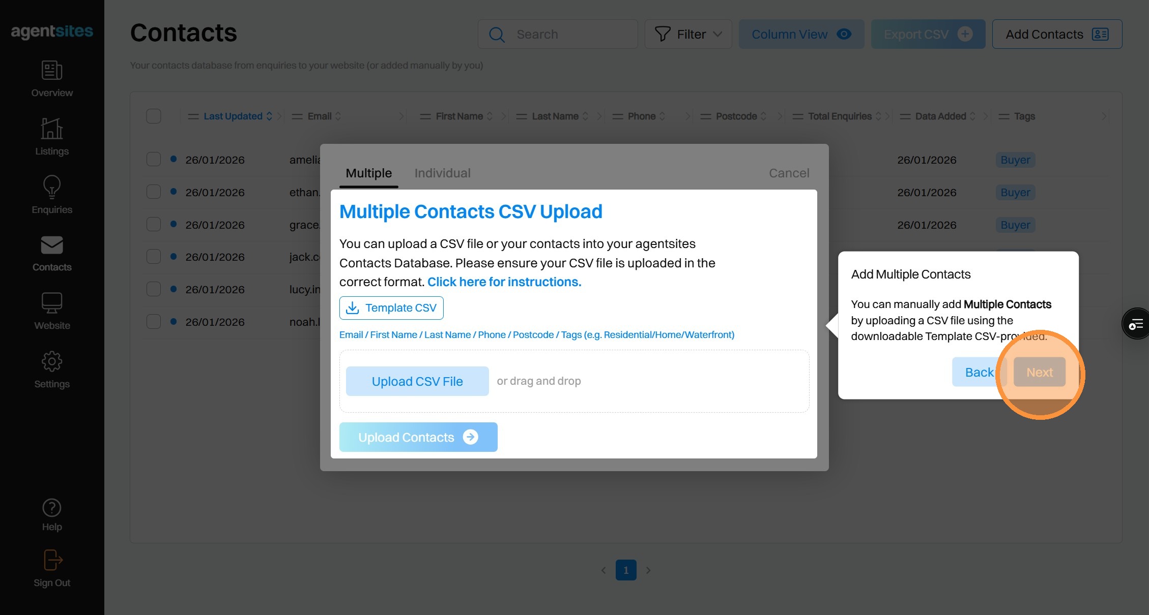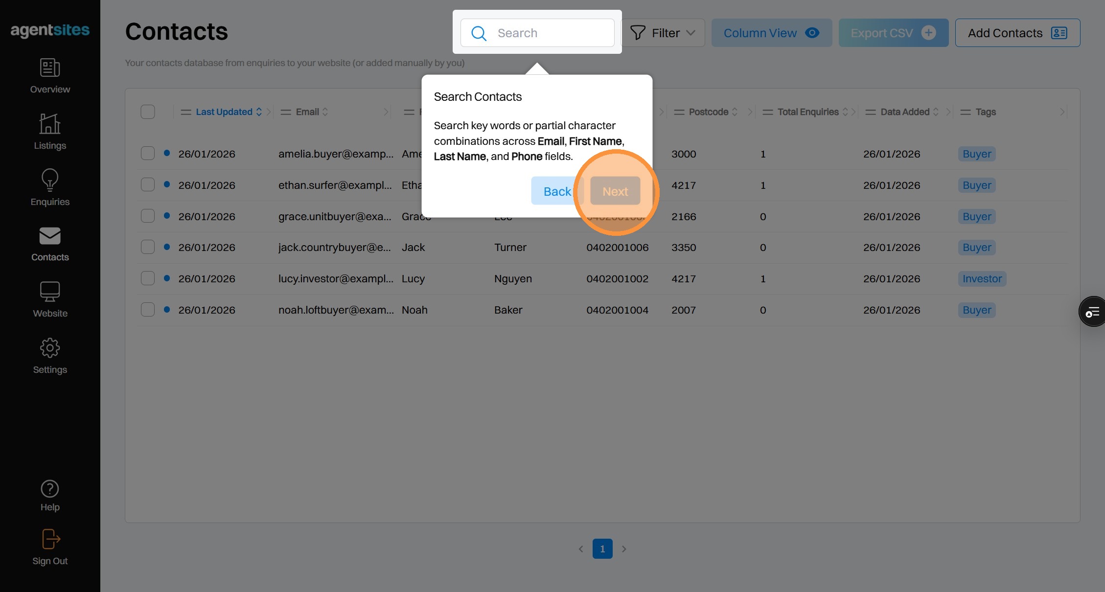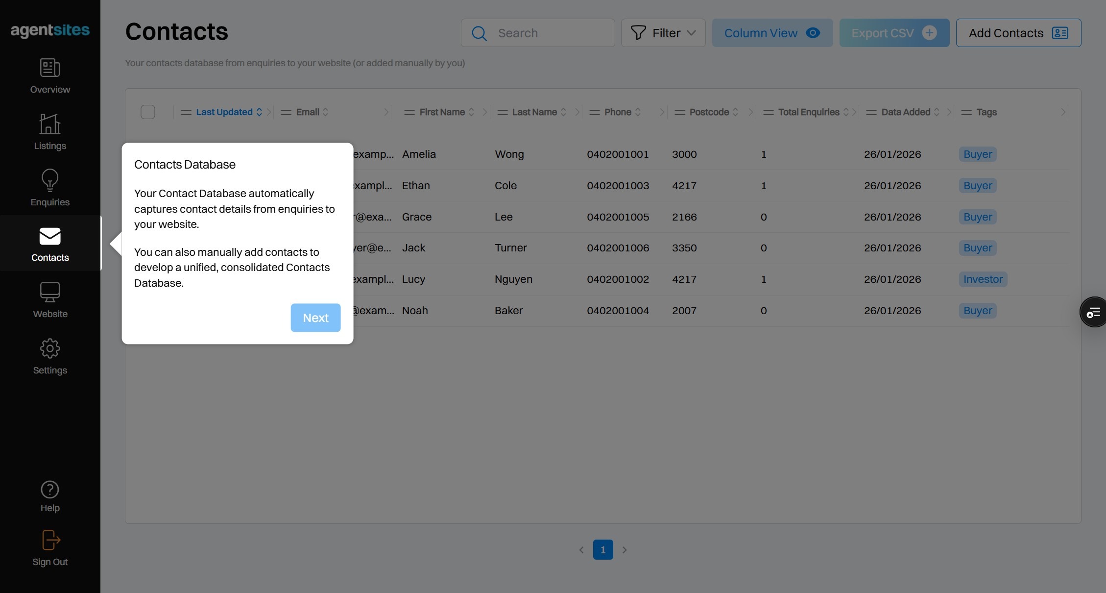 Walkthrough tour of the 'Contacts' dashboard.