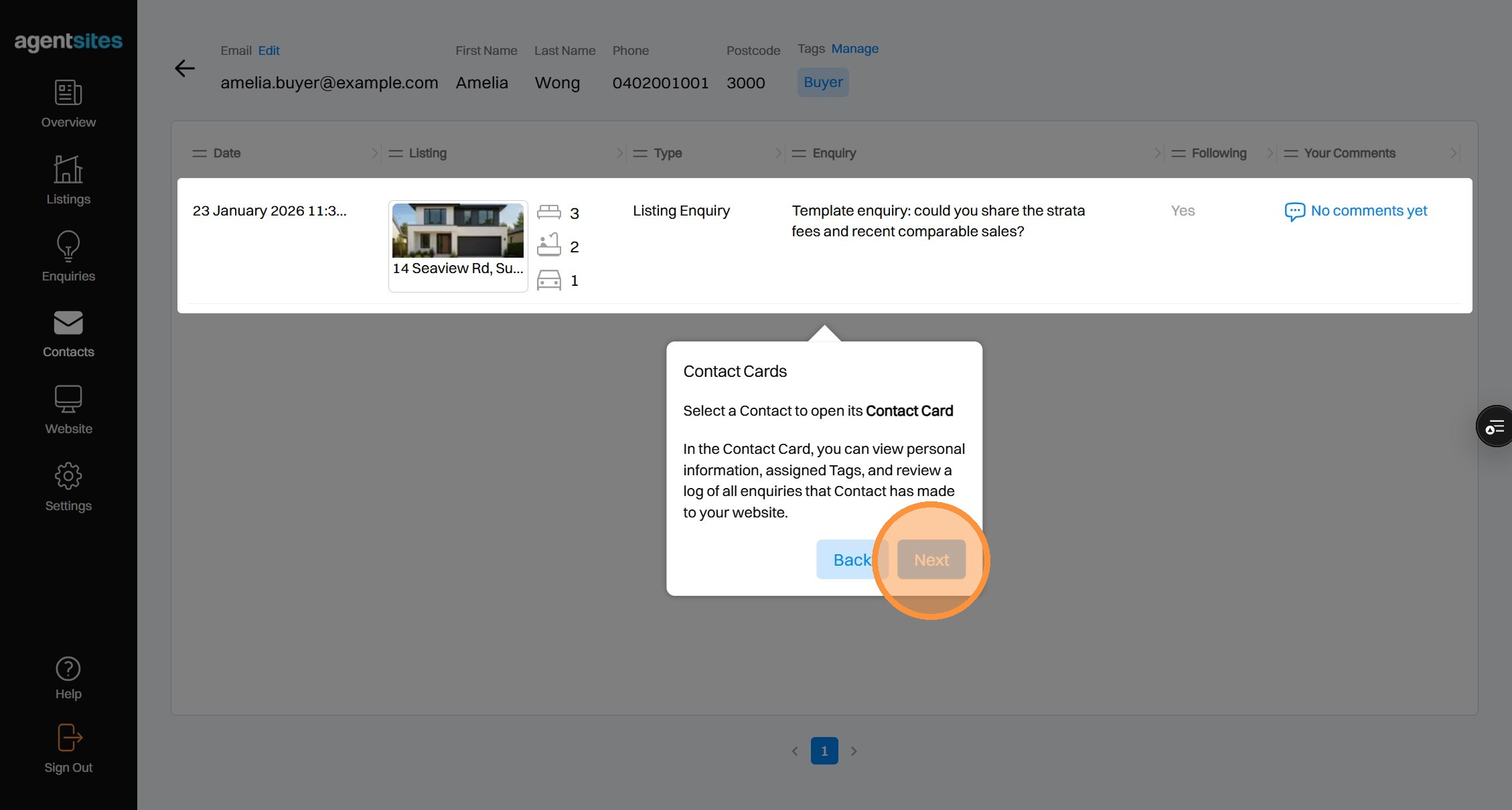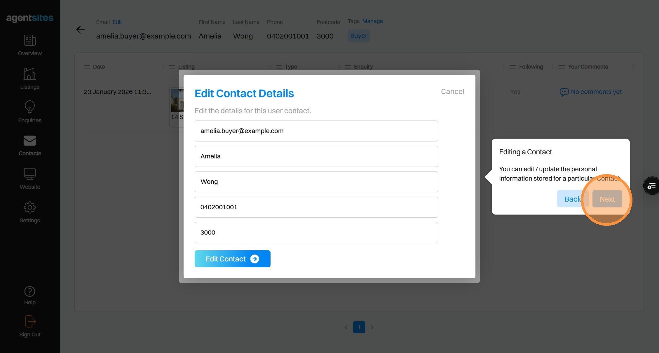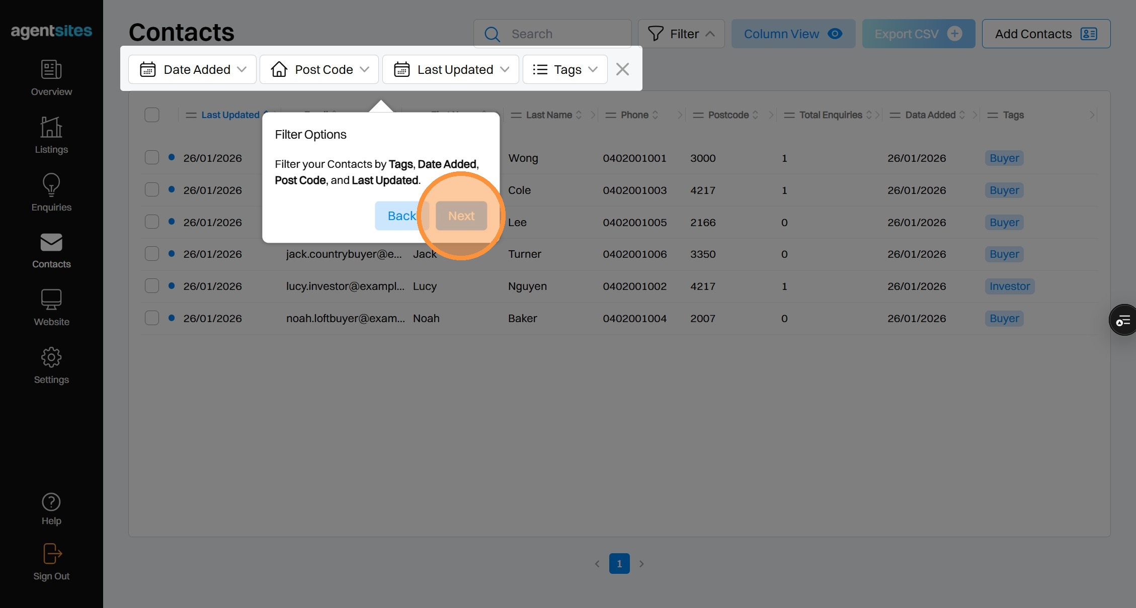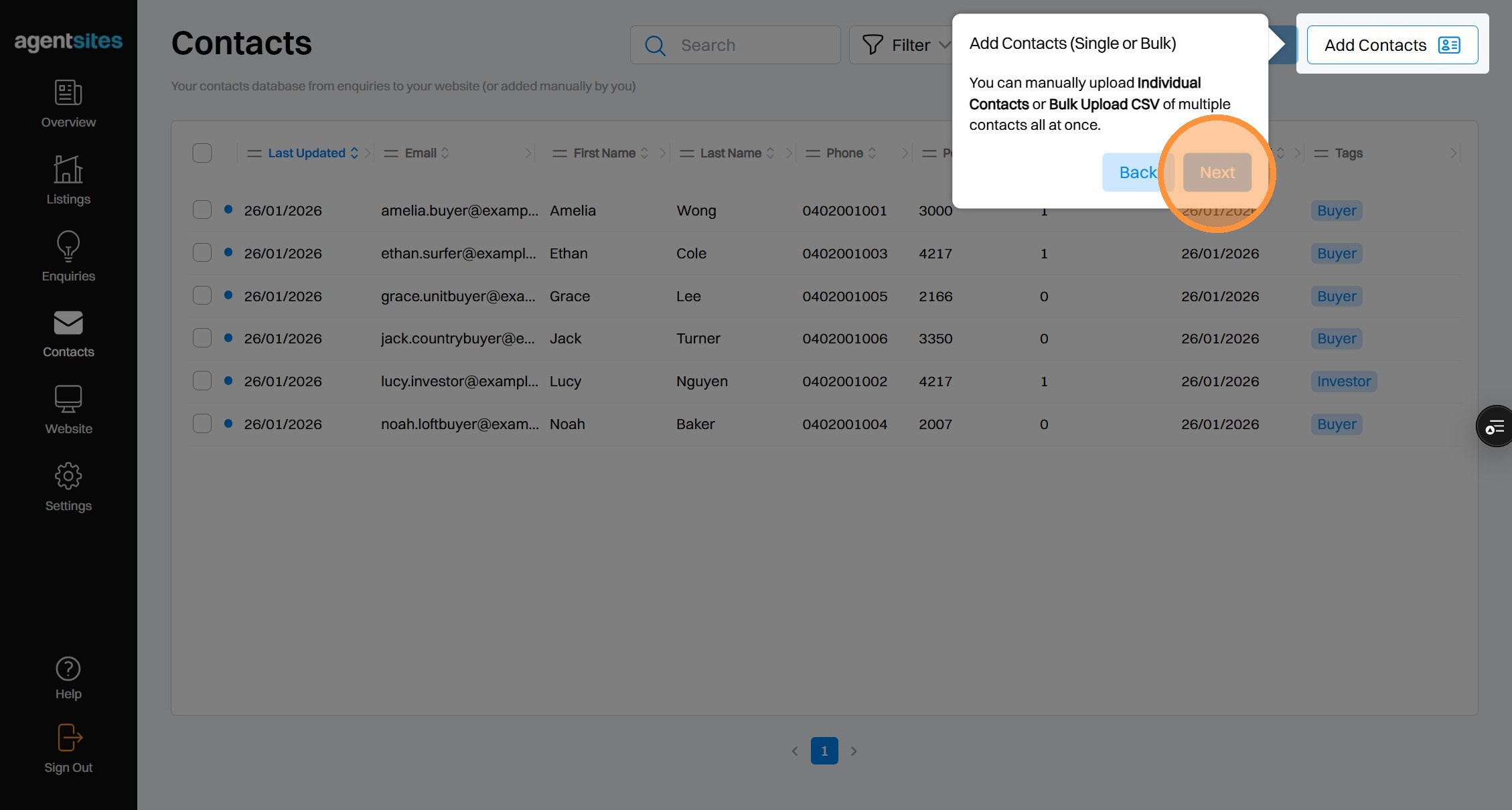 Walkthrough tour of the 'Contacts' dashboard.