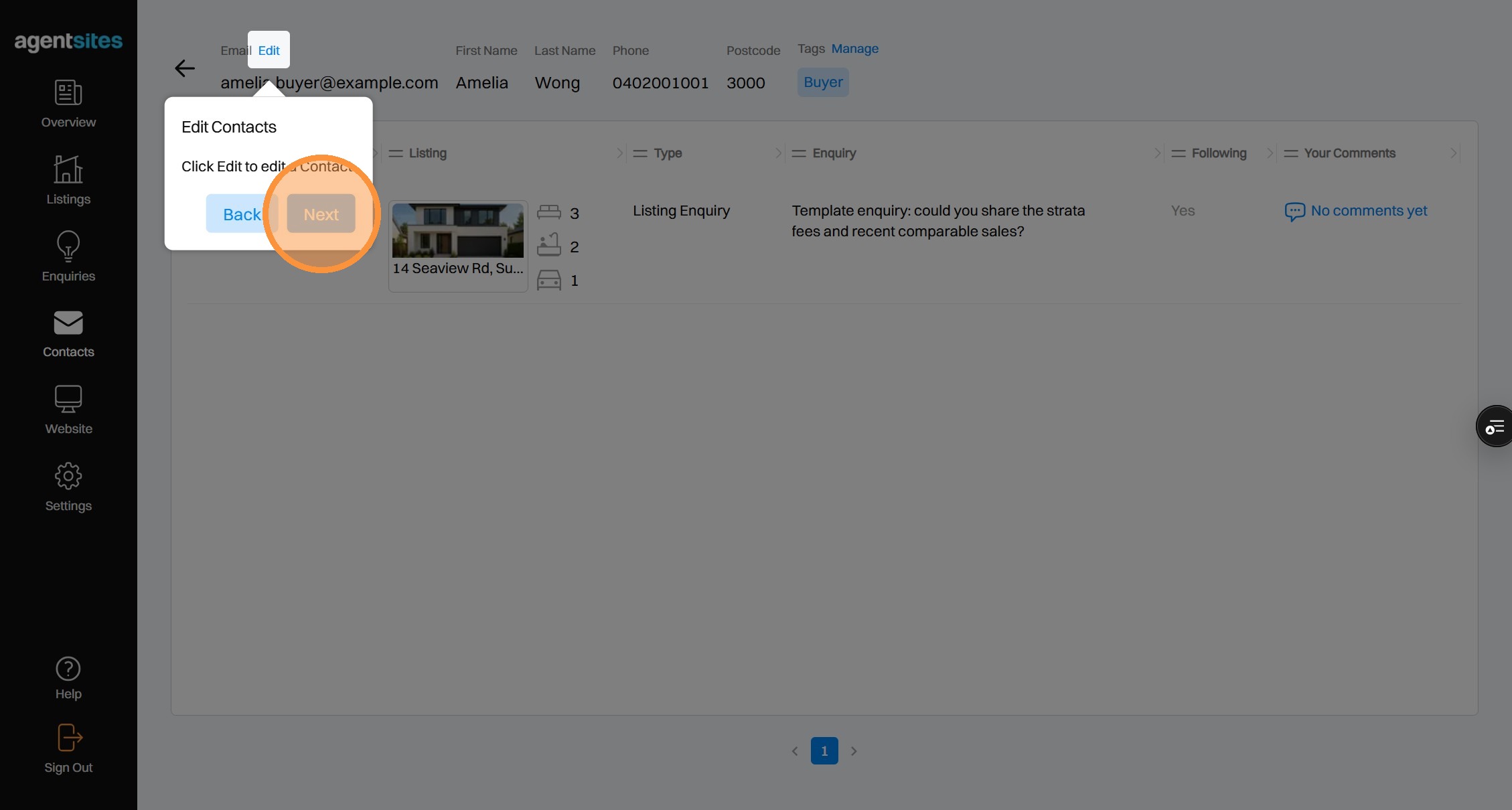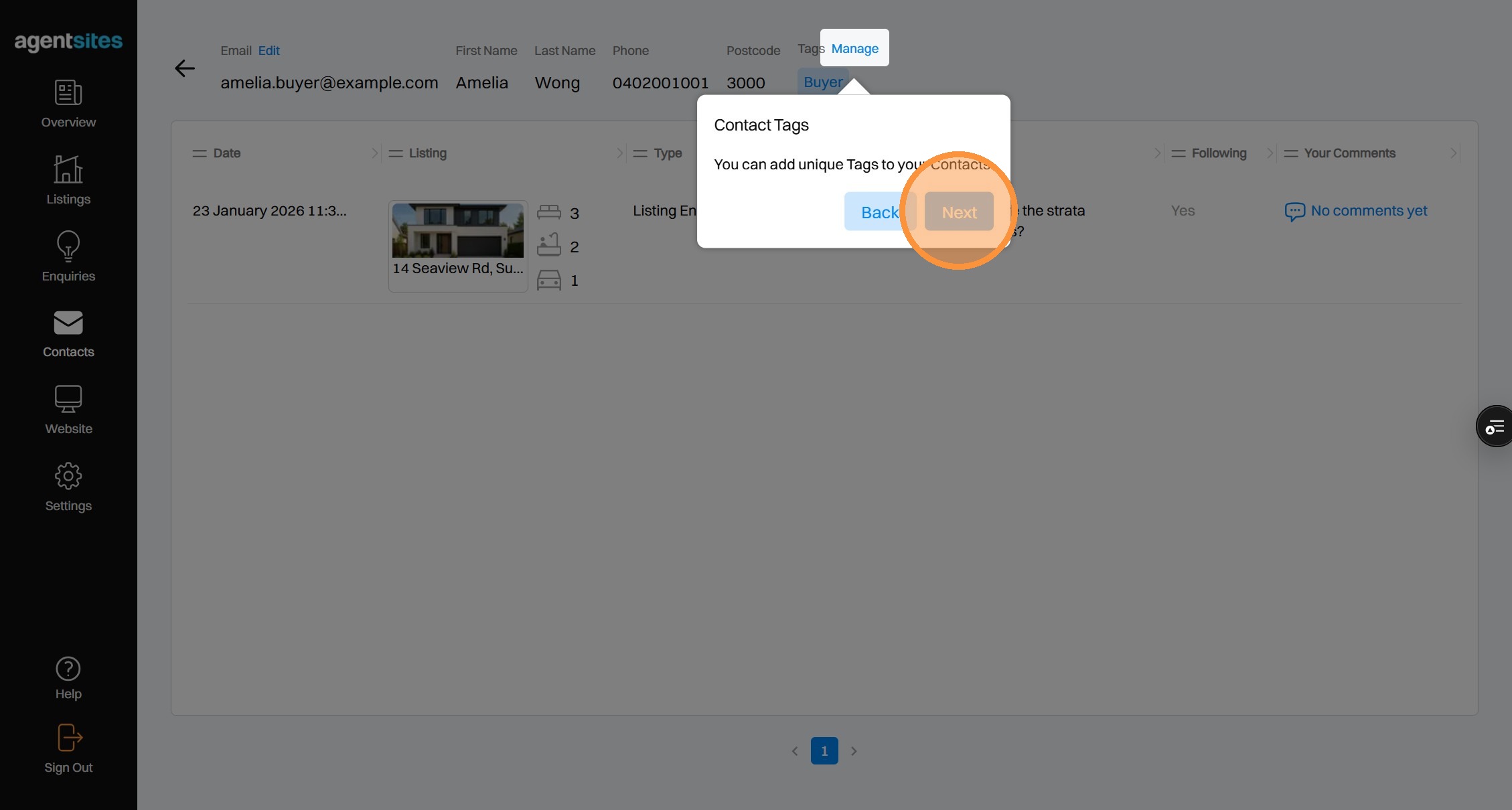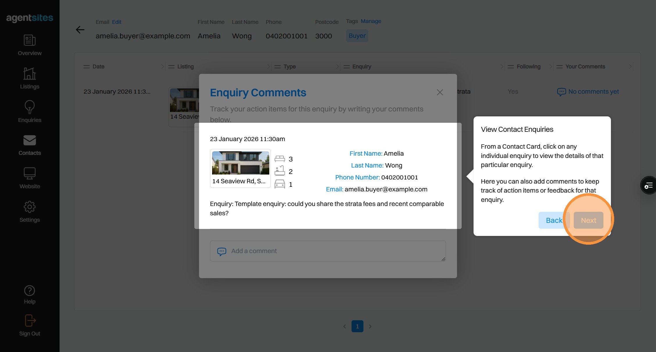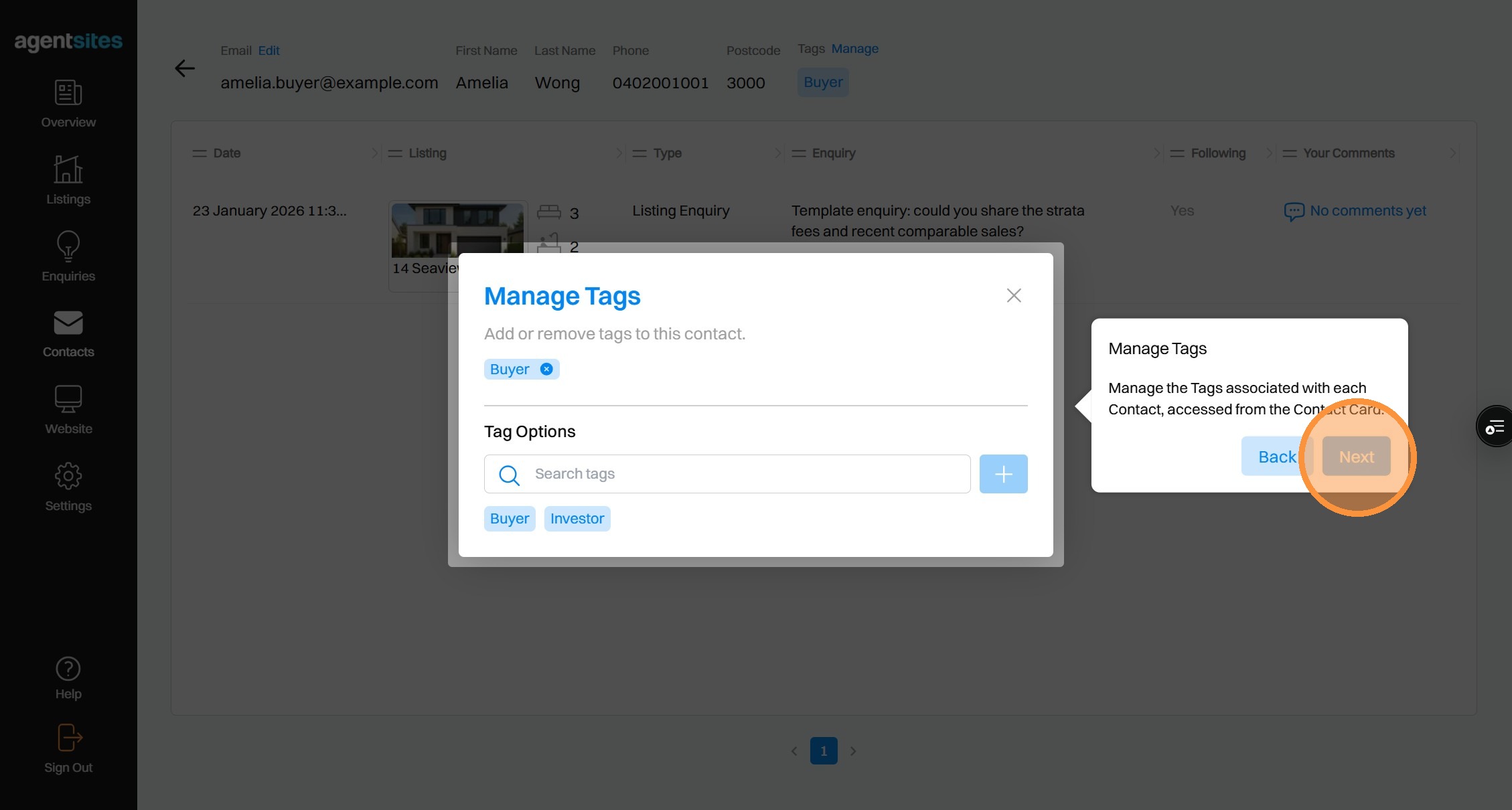 Walkthrough tour of the 'Contacts' dashboard.