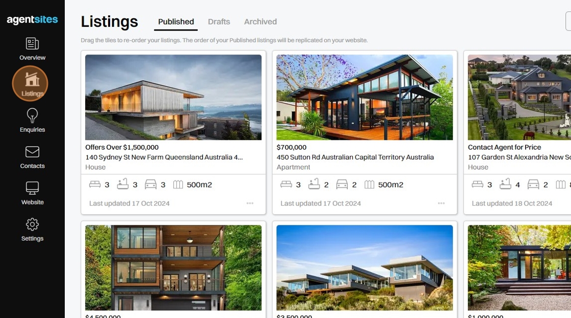 6. Re-Order Listings directly from the Listings section by dragging the Listing Tiles. The order of your Listing Tiles (for Published Listings only) will automatically be reflected onto your Website.