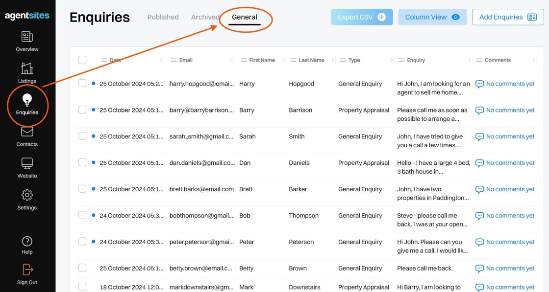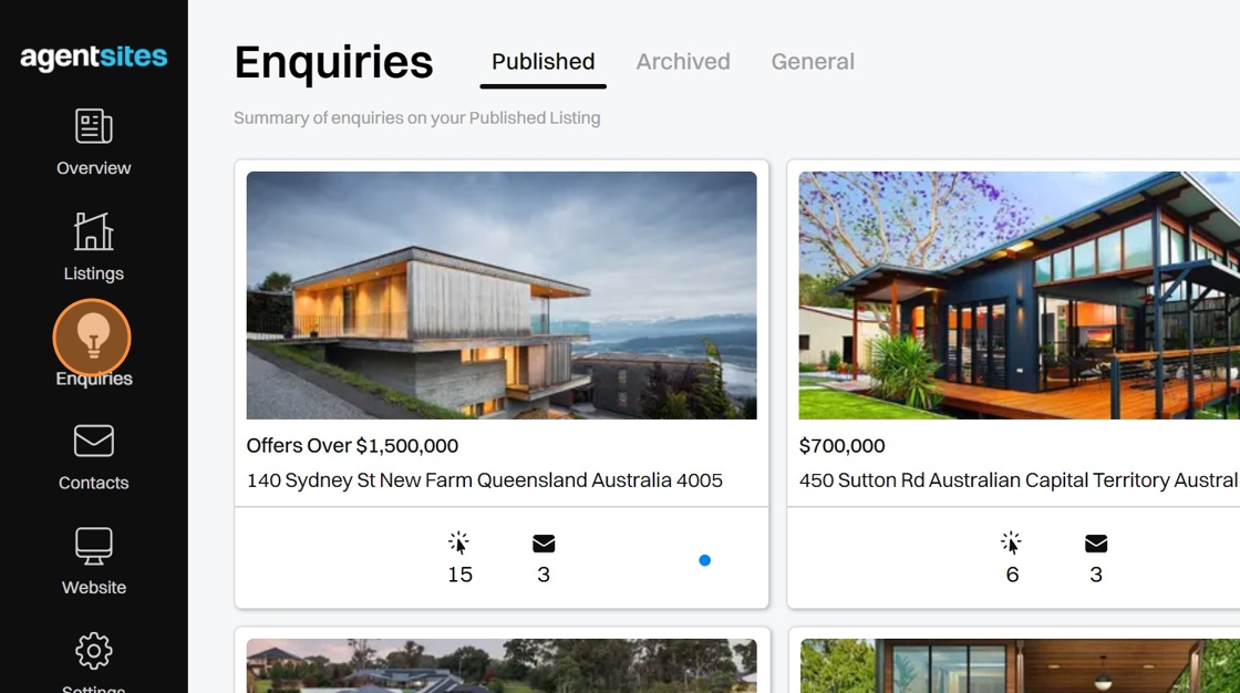 3. General Enquiries are submitted directly to your Website landing page and are not related to an individual Listing.