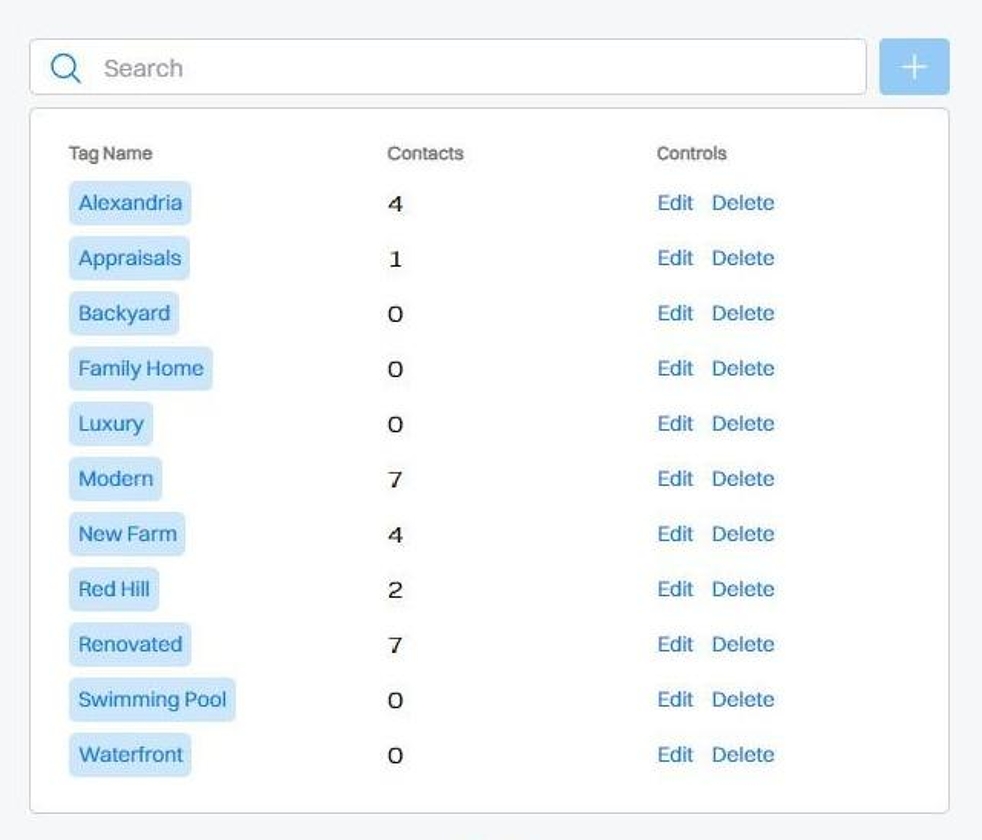 Tags let you to assign customised designators to your Contacts. This allows you to filter your Contacts at a later date to narrow down your search results to Contacts that apply to specific Tags. e.g. The Tag "Luxury Properties" could be assigned as a Tag to certain Contacts, enabling you to filter your Contacts database to target specific audiences in an upcoming marketing campaign relevant to Luxury Properties.