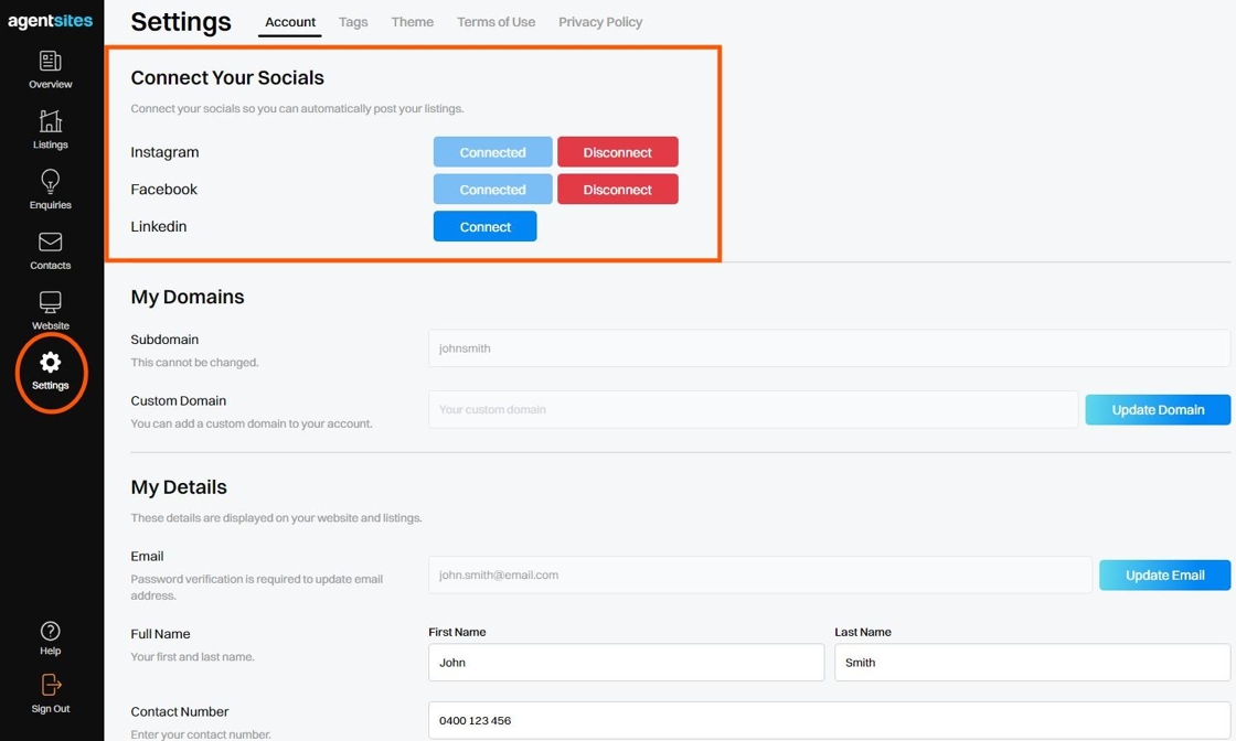 1. You can connect your Social Media accounts (Instagram, Facebook and LinkedIn) to your Agentsites account.