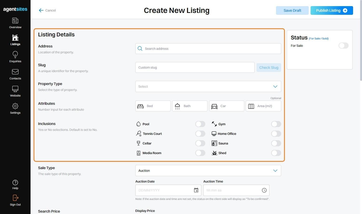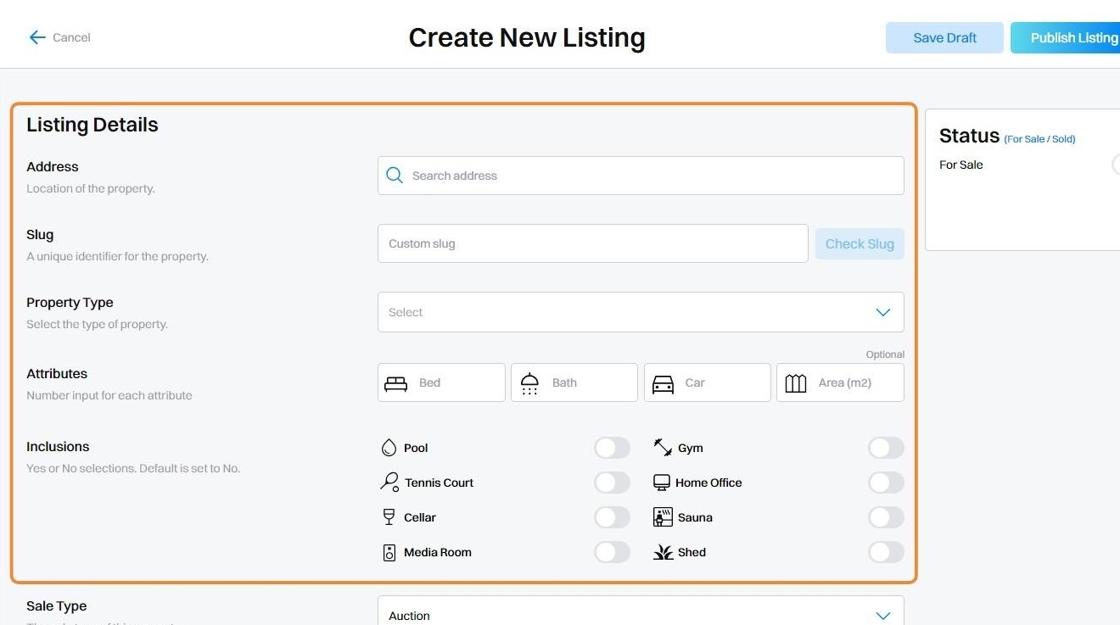 3. Set the Status of the Listing, either as For Sale or Sold.