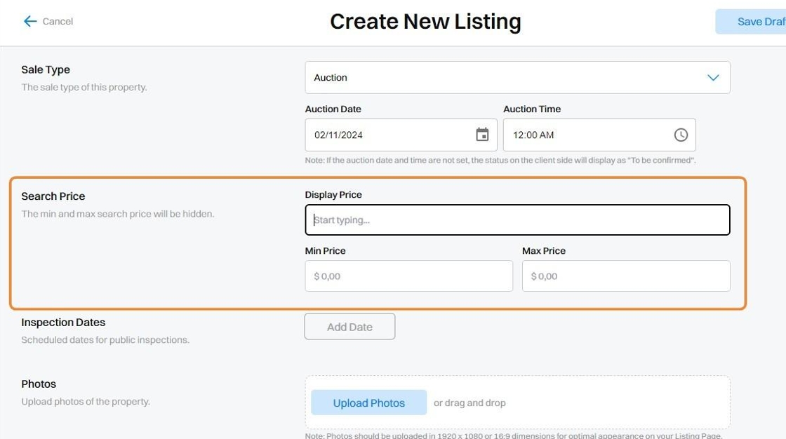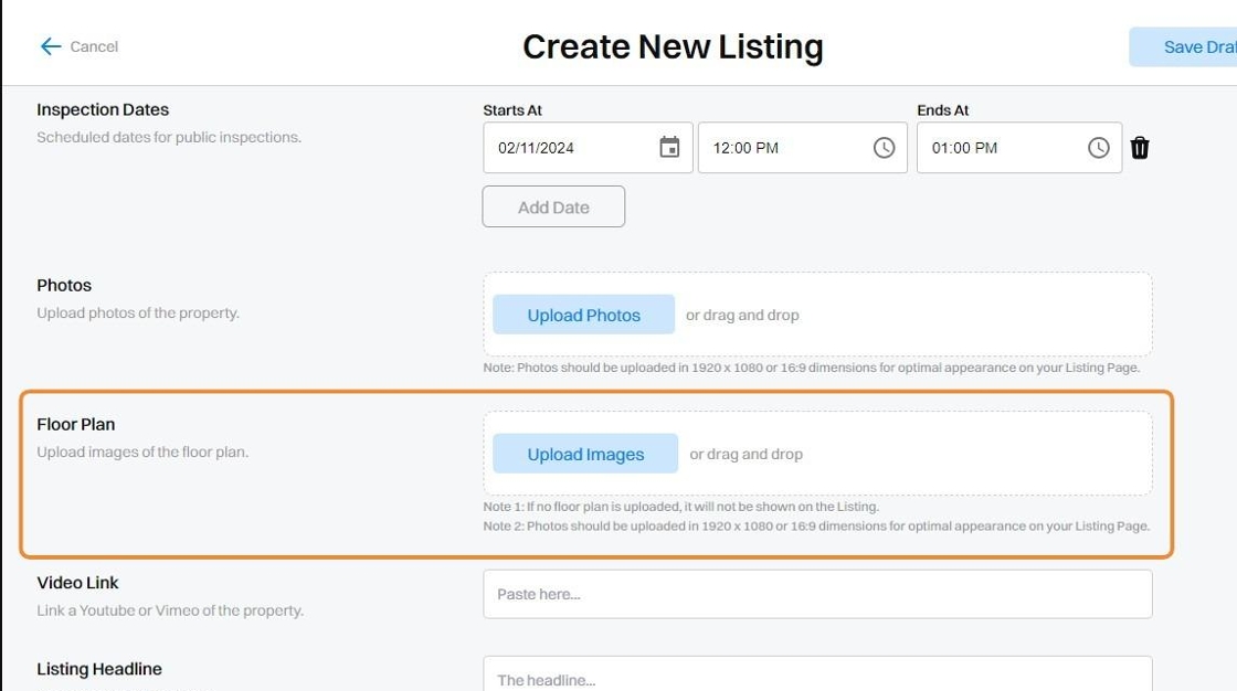 (Note: If this is left blank, your published listing page will show the Inspection Dates as 'To be confirmed' until they are added later).
