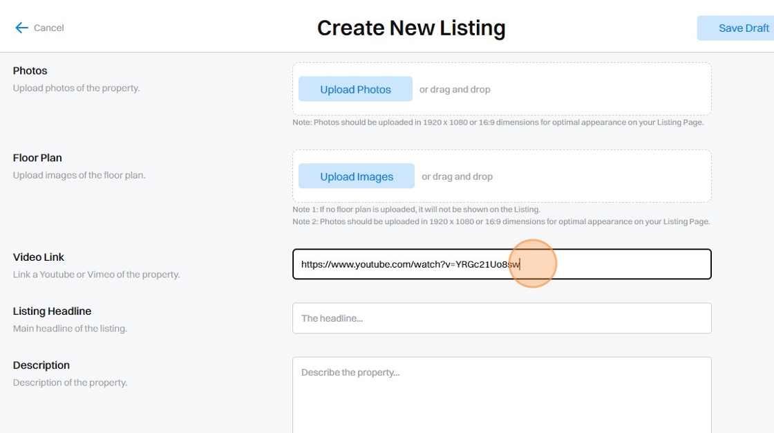 Note: This can be left blank if no video is available for the Listing. No video link will appear on the published Listing page.