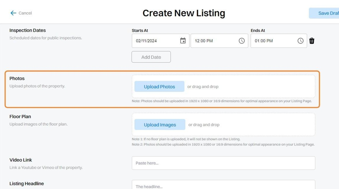 7. Upload Photos of the property using either File Upload or Drag-and-Drop.