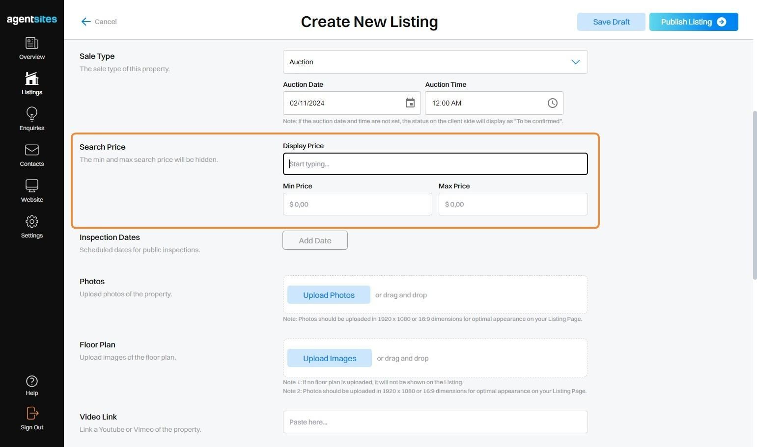 For the Search Price, which is not displayed publicly, set the Min and Max price range for the Listing (note: the Search Price is not shown publicly on your Website).